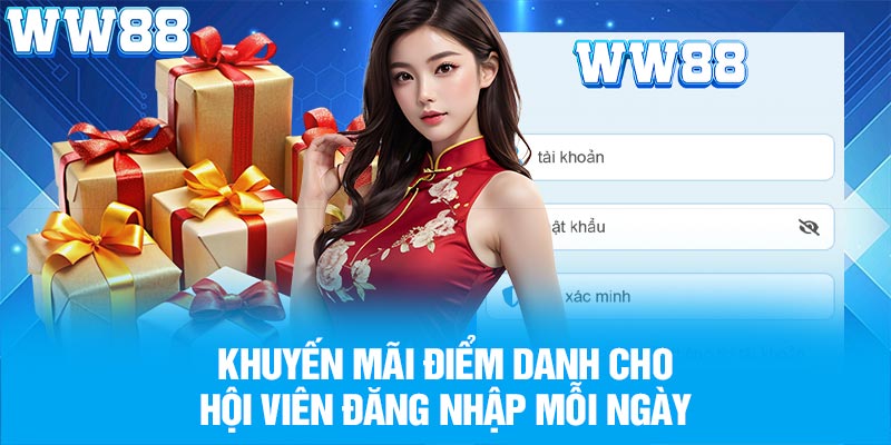 Người chơi sau khi đăng nhập WW88 sẽ nhận ưu đãi điểm danh mỗi ngày với tổng giá trị lên đến 3.000.000 VNĐ mỗi tháng. Hệ thống tự động cộng điểm sau mỗi lượt đăng nhập, không cần yêu cầu thủ công.